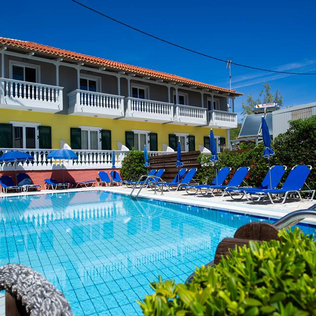 De gezellig ingerichte appartementen bevinden zich in het hoofdgebouw en de meer eenvoudige studio’s in het bijgebouw, enkele meters verderop. Wil je bij het ontwaken van de ochtend voor de afwisseling liever zoet water? Dan kun je voor een verkoelende duik ook terecht in het zwembad, om vervolgens op een ligstoeltje bij te kleuren of gewoon even weg te doezelen. Aan het einde van de dag kun je even tijdens een goed gesprek lekker genieten van een drankje en het prachtige uitzicht over zee in je op nemen.