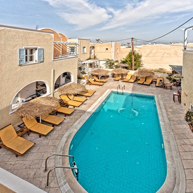 Zin om lekker te relaxen? Dan is het zwembad de ideale plek. Strijk neer op een van de houten ligbedjes in de zon of geniet van een ijskoud drankje bij de poolbar. En als je hier dan zit en verder eigenlijk niets meer hoeft, is het toch de moeite waard om er ook eens op uit te gaan. Naar het bijzondere zwarte zandstrand een klein stukje verderop of naar het centrum van Kamari.