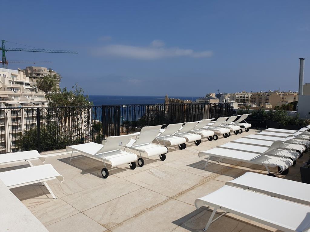 In het centrum van St. Julians, Aan de Spinola Bay, Roze zwembad op het dakterras, Wandel naar Balluta Bay, Perfecte locatie, alles dichtbij, Vissersbootjes als deco & inclusief transfers.