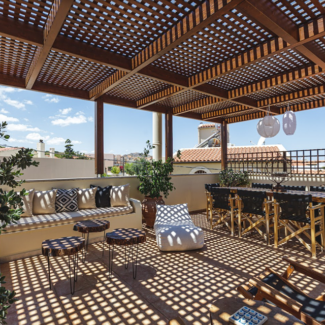 Dit kleinschalige hotel is gevestigd in een oud, traditioneel woonhuis uit de 19e eeuw. Ik word bij aankomst meteen verrast door en prachtige tuin met fantastische bloemen en planten. Een prachtige houten poort, dikke muren en authentieke luiken voor de ramen die voor dit dorp zo typerend zijn en… ‘zie ik daar nu een wensput?’ Als ik het huis binnenloop, maakt mijn hart een sprongetje. Ik zie houten balken tegen het plafond en een sierlijke trap naar boven. Irini, de zeer gastvrije receptioniste, vraagt of een rondleiding wil. Natuurlijk wil ik dat!